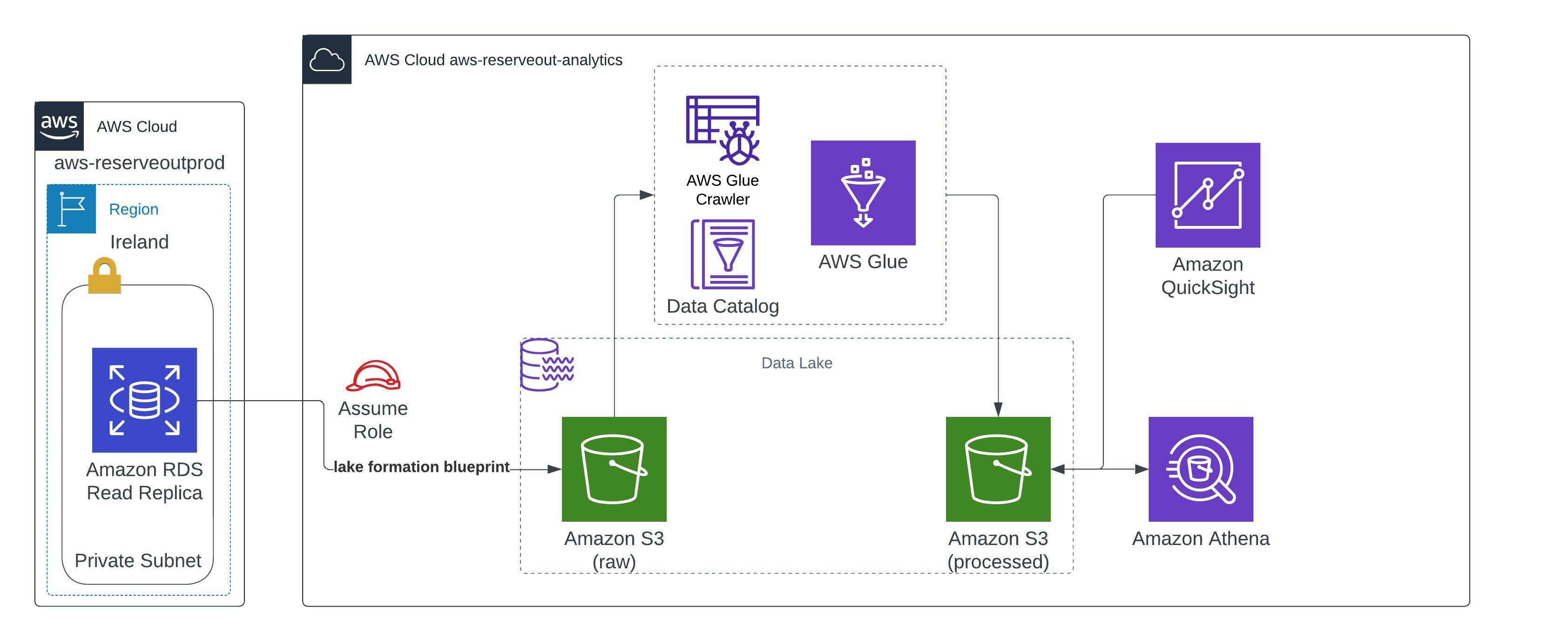 Amazon Relational Database Service (RDS) operates the databases for Reserveout. RDS is running in the aws-reserveout production account, and for analytics we created aws-reserveout-analytics account. Amazon RDS Read Replica was provided in the production account to prevent additional traffic on the RDS instance, therefore enhancing performance. In order to access the RDS Read Replica in the aws-reserveout production account, we created a role in the aws-reserveout-analytics account for the AWS Lake Formation with delegated access across the production account.