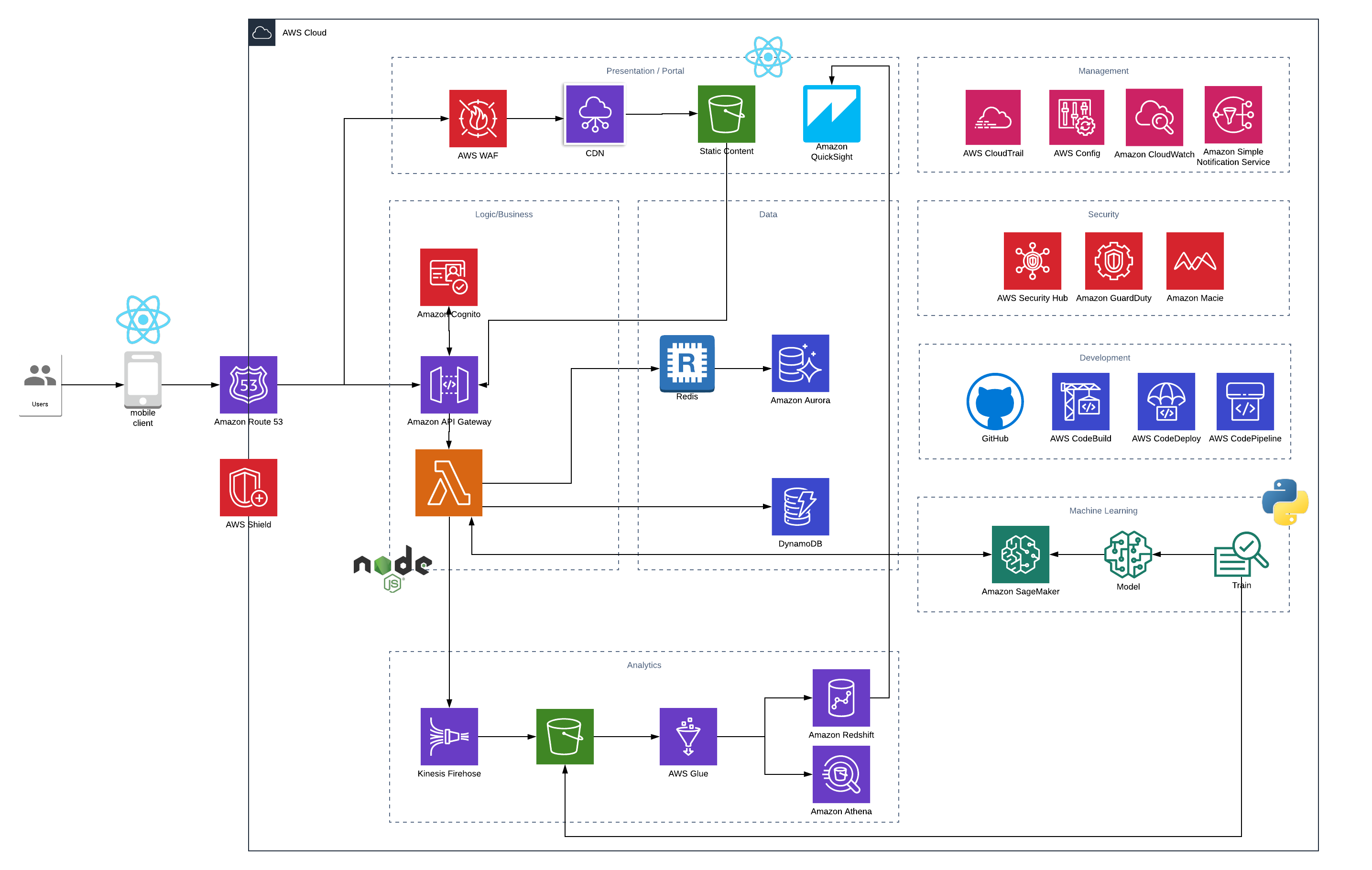 As shown in the below figure, the architecture has been completely built using the Serverless Framework, which is an open-source software which that builds, compiles, and packages code for serverless deployment, and then deploys the package to the cloud. Moreover, the serverless framework has also been utilized to build serverless AWS services such as AWS Lambda, AWS Cognito, AWS API Gateway, AWS DynamoDB, and many more. Zero&One has introduced a fully automated CI/CD pipeline using AWS CodePipeline for the new deployment strategy knowing the many features that this service supports in conjunction with AWS Codebuild and AWS Codedeploy. Our solution depends on the Canary deployment strategy that is responsible for shifting a specific amount of traffic to a new Lambda version within a specific period of time until all the traffic is completely shifted to the new version.